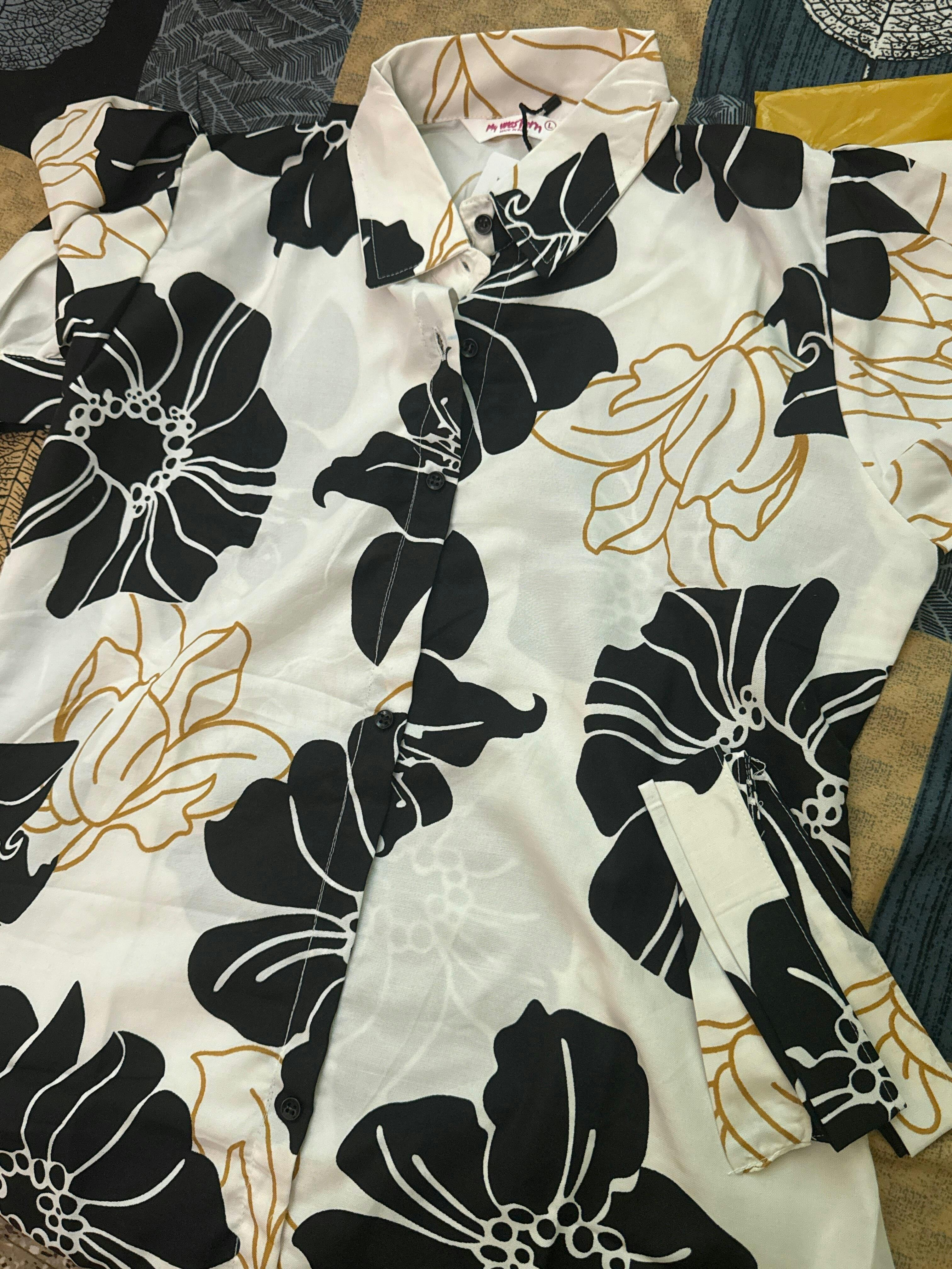 🖤 Oversized Black Floral Print – Striking contrast on a soft cream base for bold yet classy vibes👗 Waist-Defining Belt – Tie-up belt cinches perfectly to highlight your shape🤍 Crisp White Collar & Cuffs – Adds structure and sophistication to the flowing silhouette✨ Ankle-Length Design – A graceful touch for everyday glam or semi-formal flair🌬️ Smooth Rayon Fabric – Lightweight, breathable, and ideal for Indian weather